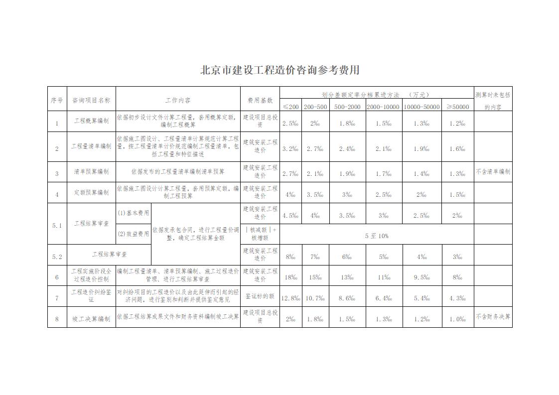 >北京市建设工程造价咨询参考费用